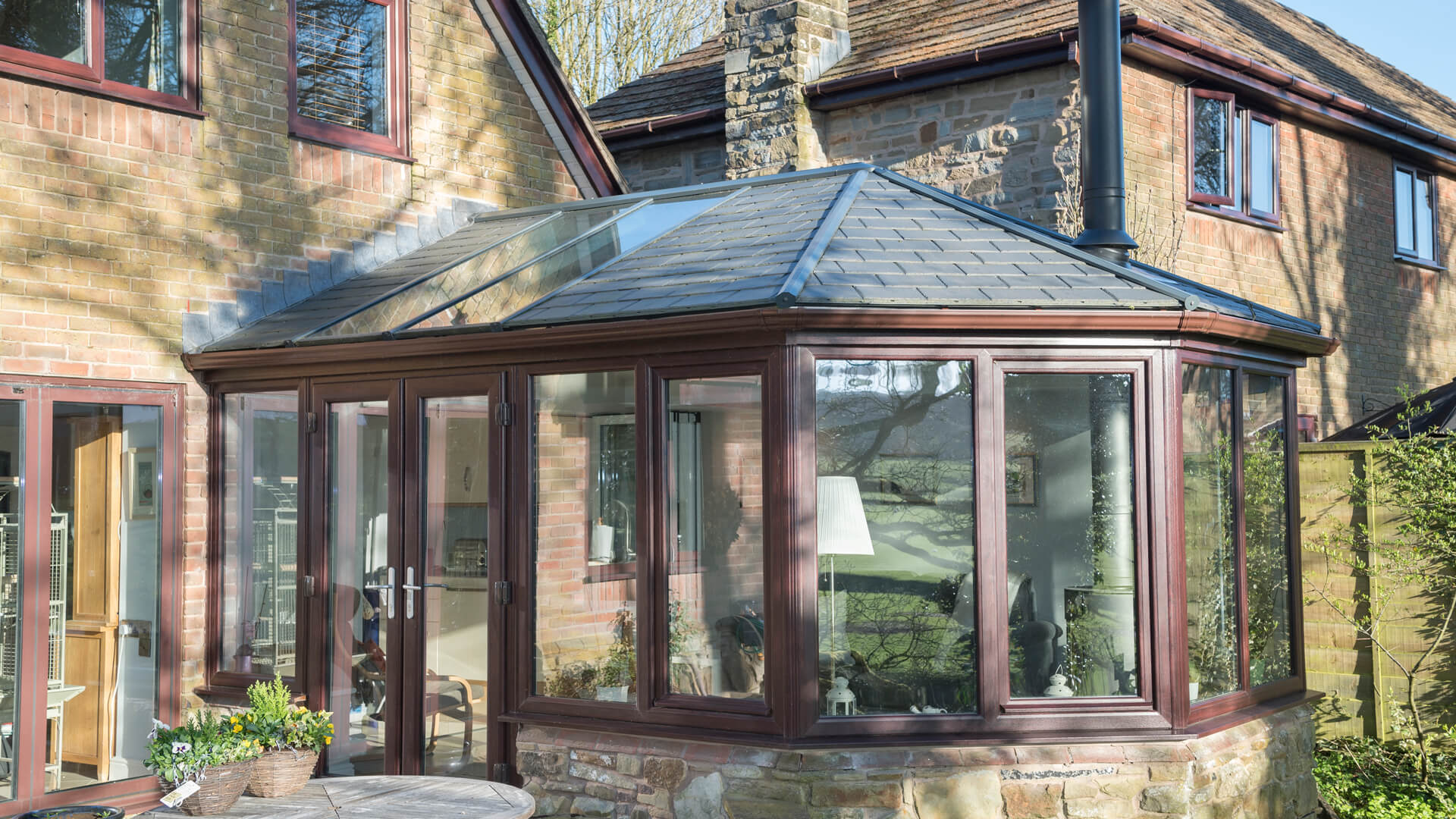 This style of conservatory suited the way the property is configured and integrated perfectly into the house. Fully aware that the Ultraroof would assure them of sustained insulation, the occupants loved the idea of having a fire in the heart of the design so that they can feel extra cosy indoors during winter. It took a lot of hard work to get this extraordinary fireplace up and running, but we managed it. The positioning of the flue needed to be exact and it protrudes through the Ultraroof expertly to enable any noxious gases to escape away from the structure. You can see how pleased this stunning conservatory has made the lady of the house who finds herself in there at every opportunity she gets.